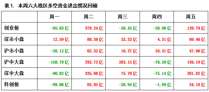 从表1的每日六大战区多空资金进出情况中可以看到,在本周五个交易日中,虽然周一与周四,空方都曾大幅施压,但多方均没有全面溃败,总是有个别战区顽强的保持着资金流入状态;而周一之后的周二,以及周四之后的周五,多方都及时予以反击,不仅当天六大战区均呈现为全面资金流入状态,且资金回流的力度也会明显超过前一日资金出逃的力度,也正因如此,场内的恐慌情绪才无法持续蔓延,投资者的做多热情依然维持在较高水平。在这种情况下,行情就很难出现连续大幅杀跌,市场在4000点上方经过震荡整固之后,或有继续向上拉升的可能。