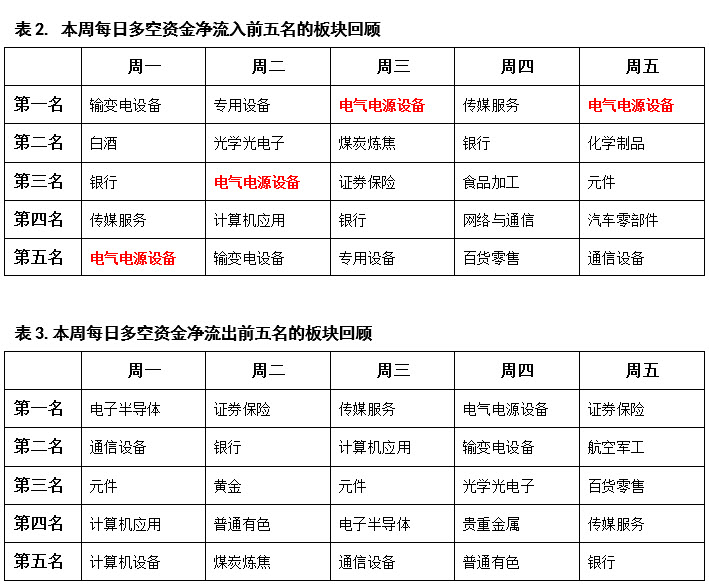 从表2的每日资金流入排行榜前五名来看,本周做多最为积极的是电气电源设备板块,该板块在本周五个交易日内四度出现在资金流入榜前五名之内。此外,银行板块在本周也连续发力,三度出现在资金流入榜前五名之内。可见虽然近期行情出现了回探,且本周大盘在4000点至4100点之间反复震荡,后市方向并不明显,但市场中依然存在着可持续做多的热点。在这种情况下,多方人气就不会完全涣散,所以行情向下回调的空间将较为有限。待市场下方基础逐步夯实后,大盘或有继续上攻的可能。
