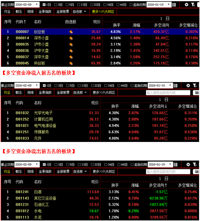 从板块资金动向数据来看,截止到今日收盘时,在资金流入榜上,光学光电子板块以126.66亿的资金流入额位居榜首;其次是计算机应用板块,资金流入107.66亿;此外,电气电源设备板块、传媒服务板块、元件板块也都相继上榜,三个板块的资金流入额分别为101.18亿、91.67亿、85.20亿;再看资金流出榜,全天只有三个板块为资金流出状态,且各板块的资金流出额均不足两亿,这三个板块分别是白酒板块、其他交运设备板块、以及石油化工板块。从六大战区的情况分别来看,截止到今日收盘时,六个战区均为资金流入状态,其中不仅科创板战区资金流入115亿,深中大盘战区资金流入252亿,沪中大盘战区资金流入342亿,创业板战区的资金流入额更是高达420亿。可见今日各战区均有资金大幅进场加仓,净流入数额超过千亿,多方力量呈现出压到性优势。在这种情况下,指数快速突破5日成本均线压制,市场短期走势出现重新转强迹象。虽然由于今日资金进场过于迅猛,且大盘刚刚重新回升到4100点整数关口上方,接下来一两天行情或有震荡整固的可能,但后市大概率会进一步向上攀升。建议大家紧跟资金步伐,积极优选个股,择机低吸。