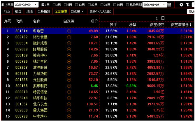 【今日多空资金增仓前200名中涨幅最小的15只个股】