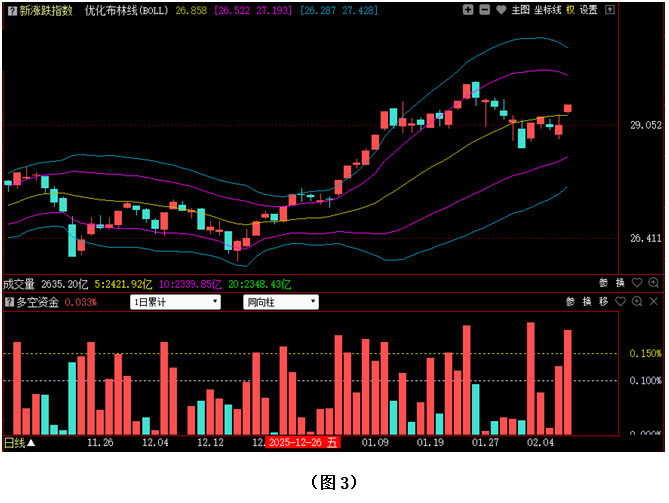 今日两市上涨个股共4372只,其中涨幅超过3%的个股977只,涨幅在9.9%以上的个股116只;下跌个股共717只,其中跌幅超过3%的个股69只,跌幅在9.9%以上的个股3只。图3所示为指南针特有的0Z指数K线图,从图中可以看到,今日0Z指数高开在优化布林中轨上方,并继续向上拉升,最终以阳线报收。可见今日场内多数个股都出现了上涨,市场整体走势出现转强迹象。从下方的多空资金来看,今日多空资金为流入状态,且资金流入量较上周五继续增加,说明多方资金不仅持续加仓,且进场力度越来越强。在这种情况下,行情就有了进一步上攻的动能,所以接下来0Z指数有望站稳在优化布林中轨上方,并继续向上拉升