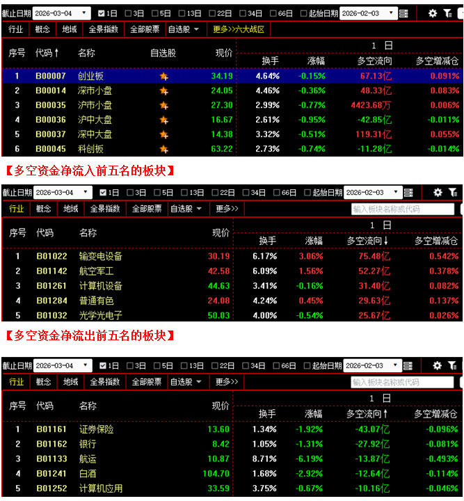 从板块资金动向数据来看,截止到今日收盘时,在资金流入榜上,输变电设备板块以75.48亿的资金流入额位居榜首;其次是航空军工板块,资金流入52.27亿;此外,计算机设备板块、普通有色板块、光学光电子板块也都相继上榜,三个板块的资金流入额分别为31.40亿、29.63亿、25.67亿;再看资金流出榜,证券保险板块引领做空,资金流出43.07亿;其次是银行板块,资金流出27.92亿;此外,航运板块、白酒板块、计算机应用板块的资金流出额也都相对较多,分列资金流出榜第三到第五名位置。综合比较后可知,今日虽然证券保险板块超过40亿,同时银行板块的资金流出额也在25亿之上,但其余板块中的抛压较昨日明显减轻,恐慌情绪有所下降;反观多方阵营,不仅输变电设备板块资金流入高达75亿,航空军工、计算机设备、普通有色、光学光电子等板块的资金流入额也都在25亿之上,说明已有部分资金开始趁机逢低进场加仓,若后市行情逐步企稳,这些率先获得资金回流的板块有可能会成为新的领涨热点。从六大战区的情况分别来看,截止到今日收盘时,沪中大盘战区与科创板战区均为资金流出状态,且沪中大盘战区资金流出超过40亿;其余四个战区则均为资金流入,其中不仅创业板战区与深市小盘战区资金流入双双超过48亿,深中大盘战区的资金流入额更是高达119亿。可见虽然在昨日大跌之后,投资者的做多信心依然普遍偏弱,以致今日行情仍有惯性下跌的动作,但多数战区已有资金明显回流,整体上多方力量再次占据优势。在这种情况下,市场继续大幅杀跌的可能性相对较小,短期内随时可能出现反弹,但反弹的高度以及持续时间长短则取决于多方资金回流力度的大小。建议大家认真甄别手中个股,对于前期涨幅过大且近期有资金连续出逃的个股,可在行情反弹时逢高逐步减仓;而对于前期涨幅不大且近期仍是以资金流入为主的个股,则可逢低逐步加仓,摊低成本,等待行情好转。