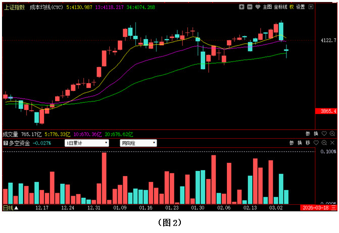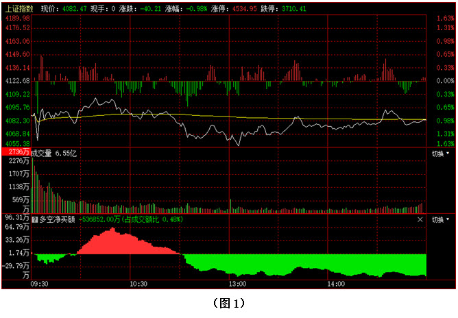 如图1所示,今日早间大盘低开,盘中虽有向上反弹动作,但力度明显不足,以致指数刚刚回升到4100点整数关口附近就遇到阻力,随后市场逐步回落,一度跌至4060点下方,好在大盘并未持续杀跌,下午一点半后指数缓慢回升,最终以4082点收盘。从下方的多空资金来看,早间开盘后,多空双方你来我往,反复争夺,但由于大盘迟迟无法向上形成有力反弹,午后资金进场的积极性明显减弱。可见今日空方力量依然较强,大盘继续受到空方压制,不过从午后走势看,行情短期已有一定企稳迹象。在这种情况下,如果明日多方发力反击,大盘就有可能向上回补今日早间的跳空缺口。建议大家在控制好仓位的同时,可关注前期有资金连续加仓的个股,跟踪观察,待行情企稳后,逢低吸纳。