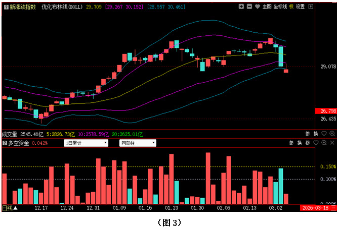 今日两市上涨个股共1627只,其中涨幅超过3%的个股347只,涨幅在9.9%以上的个股57只;下跌个股共3464只,其中跌幅超过3%的个股425只,跌幅在9.9%以上的个股23只。图3所示为指南针特有的0Z指数K线图,从图中可以看到,今日0Z指数低开在优化布林下轨下方,盘中向上反弹时明显受到优化布林下紫线压制,遇阻回落后虽最终以阳线报收,但收盘位置依然处于优化布林下轨下方。可见今日场内多数个股仍在回落过程当中,市场整体走势依然较弱。从下方的多空资金来看,今日多空资金为流入状态,但资金流入量明显小于昨日的资金流出量,这就说明多方虽有反击,但力度不强,所以前两日的抛压尚未得到有效化解,若多方后续力量无法及时跟上,行情或仍有继续下探的可能。建议大家控制好仓位,谨慎操作。