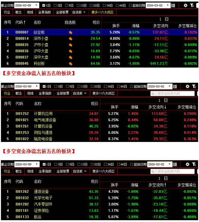 从板块资金动向数据来看,截止到今日收盘时,在资金流入榜上,计算机应用板块以113.60亿的资金流入额位居榜首;其次是电气电源设备板块,资金流入58.08亿;此外,计算机设备板块、网络与通信板块、输变电设备板块也都相继上榜,三个板块的资金流入额分别为34.38亿、30.68亿、29.32亿;再看资金流出榜,通信设备板块引领做空,资金流出37.03亿;其次是光学光电子板块,资金流出35.07亿;此外,汽车零部件板块、证券保险板块、航运板块的资金流出额也都相对较多,分列资金流出榜第三到第五名位置。综合比较后可知,今日不仅计算机应用板块资金流入高达113亿,同时电气电源设备、计算机应设备、网络与通信等板块的资金流入额也都在30亿之上,对维持场内多方人气起到积极作用,但需要注意的是,全天资金流入超过10亿的板块只有9个,若要扭转市场短期走势,整体上攻力量还有待进一步增强;反观空方阵营,通信设备板块与光学光电子板块资金流出双双超过35亿,汽车零部件、证券保险、航运等板块也都有较大资金流出,依然对市场构成着较为明显的压制。从六大战区的情况分别来看,截止到今日收盘时,创业板战区、深市小盘战区、以及深中大盘战区均为资金流入状态,且创业板战区资金流入高达137亿;其余三个战区则均为资金流出,除沪中大盘战区资金流出超过30亿之外,沪市小盘战区与科创板战区的资金流出总额尚不足15亿。可见今日既有资金大幅流入的板块,也有资金明显流出的板块,多空互不相让,争夺十分激烈。在这种情况下,行情虽没有大幅下挫,但也难以向上发起有力攻势,故此市场只得继续震荡,等待后市方向明朗。建议大家在控制好仓位的同时,关注近期震荡过程中资金以流入为主的板块,并在其中优选个股,择机吸纳。