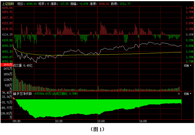 如图1所示,今日早间大盘直接低开在4100点整数关口下方,并快速下探至4050点附近,好在市场没有持续杀跌,10点后指数开始逐步向上回升,但多方持续上攻力量明显不足,以致大盘无法站稳在4100点上方,最终以4096点收盘。从下方的多空资金来看,早间开盘后不久,空方就占据优势,且资金快速流出,而在指数向上回升过程,资金虽有回流,但进场速度较慢,所以直到收盘时,空方依然占据着一定优势。可见今日早间由于大盘直接低开在4100点整数关口下方,并快速下探,场内曾有恐慌盘大量涌出,虽然10点后随着指数回升,有部分资金进场抄底,但投资者的做多热情明显受到了影响。在这种情况下,行情很可能还会出现反复,个股差异也将越来越大。故此建议大家在关注大盘走势的同时,更要认真甄别手中个股,对于反弹力度较弱且资金回流不足的个股,可逢高逐步减仓;而对于反弹力度较强且资金大幅流入的个股,则可继续以持股为主。