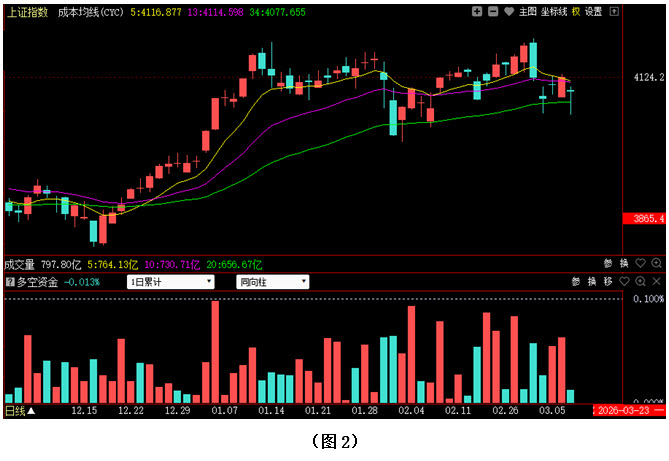 再看图2,今日大盘直接低开在4100点整数关口下方,并快速下探至34日成本均线下方,虽然经过反弹后,指数重新站上34日成本均线,但上方的5日成本均线与13日成本均线依然对指数形成压制,且两者之间即将出现死叉,可见目前市场短期走势仍相对较弱势。从下方的多空资金来看,今日多空资金为流出状态,不过资金流出量明显小于上周五的资金流入量,故此接下来只要多方及时发力,推动大盘快速突破5日成本均线与13日成本均线的双重压力,行情就仍有向上拉升的机会。建议大家在控制好仓位的同时,密切关注多空资金的进出情况以及5日成本均线对大盘的压制情况,若多方快速发力,指数轻松突破5日成本均线,则可适当加仓做多;反之,操作上则仍需谨慎。