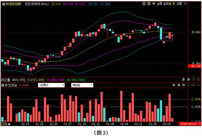 今日两市上涨个股共1375只,其中涨幅超过3%的个股336只,涨幅在9.9%以上的个股60只;下跌个股共3715只,其中跌幅超过3%的个股650只,跌幅在9.9%以上的个股9只。图3所示为指南针特有的0Z指数K线图,从图中可以看到,今日0Z指数同样低开,盘中下探到优化布林下轨附近获得支撑,随后出现反弹,最终小幅收阳,但收盘位置仍处于优化布林中轨下方。可见今日场内多数个股都未能延续上周五的拉升,而是再次出现回探,市场整体走势依然偏弱。从下方的多空资金来看,今日多空资金为流入状态,但资金流入量较上周五大幅减少,说明目前多方持续上攻的能力依然不足。在这种情况下,一旦空方连续施压,行情很有可能会出现进一步下探的动作。故此建议大家控制好仓位,切勿盲目重仓追涨。