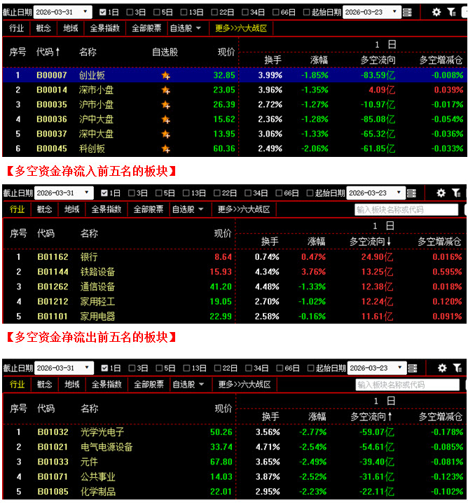从板块资金动向数据来看,截止到今日收盘时,在资金流入榜上,银行板块以24.90亿的资金流入额位居榜首;其次是铁路设备板块,资金流入13.25亿;此外,通信设备板块、家用轻工板块、家用电器板块的资金流入额也都相对较多,分列资金流入榜第三到第五名位置;再看资金流出榜,光学光电子板块引领做空,资金流出59.07亿;其次是电气电源设备板块,资金流出54.61亿;此外,元件板块、公共事业板块、化学制品板块也都相继上榜,三个板块的资金流出额分别为39.40亿、31.61亿、22.11亿。综合比较后可知,今日不仅光学光电子板块资金流出接近60亿,电气电源设备、元件、公共事业等板块的资金流出额也都在30亿之上,由于这些板块大多为前期做多人气极高的热点板块,所以它们的联手大幅做空导致场内多方人气快速下降,全天资金流出超过10亿的板块达到14个;反观多方阵营,虽然银行板块资金流入超过20亿,同时铁路设备、通信设备、家用轻工、家用电器等板块的资金流入额也均在10亿之上,但彼此之间关联性不强,难以形成群体上攻效应。从六大战区的情况分别来看,截止到今日收盘时,除深市小盘战区有4.09亿资金流入之外,其余五个战区均为资金流出状态,其中不仅深中大盘战区与科创板战区资金流出双双超过60亿,创业板战区与沪中大盘战区的资金流出额更是均在80亿之上。可见今日资金以流出为主,空方力量在整体上明显强于多方,使得前几日刚刚略有提升的多方信心再次遭受打击。在这种情况下,若多方无法及时发力反击,任由空方连续施压,近期的反弹成果将很快丧失殆尽,后市很可能还会有进一步下探的动作。建议大家控制好仓位,谨慎操作。