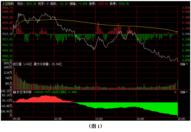 如图1所示,今日早间大盘一度快速上冲,但临近3950点时,上方压力开始显现,多方几次尝试均未能向上突破,10点半后指数出现连续回落,虽然市场在3900点附近获得支撑,并出现反弹,但力度很弱,下午两点后,大盘再度杀跌,指数跌破3900点整数关口,并进一步下探,最终以3891点收盘。从下方的多空资金来看,早间开盘后,多方率先占据优势,但随着大盘冲高回落,场内抛压持续增强,资金也由红翻绿,而下午指数依托着3900点整数关口支撑向上反弹时,资金回流力度很小,所以市场难以持续上扬,只得再次回落,继续向下寻求支撑。可见今日多方上攻遇阻,空方再度施压,导致大盘重新回落至3900点整数关口下方。在这种情况下,建议大家在控制好仓位的同时,密切关注多空资金的进出情况,如果多方连续发力,快速夺回3900点,后市或有继续向上反弹的可能;但若是多方后续无力,空方连续施压,3900点整数关口就会由原本的支撑位置就会变为压力位,使得多方在后市中的反击难度进一步加大。