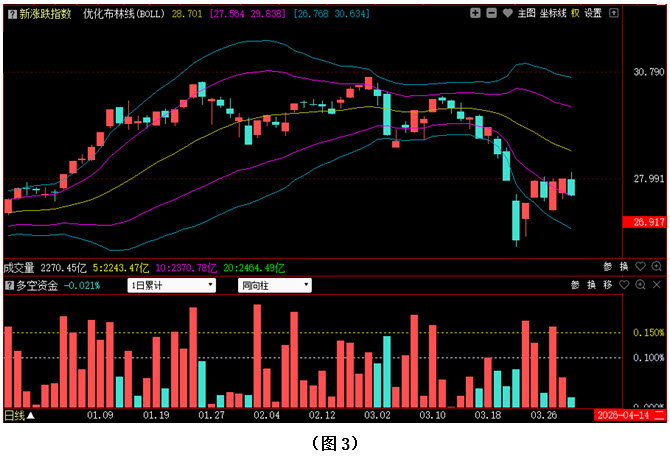 今日两市上涨个股共903只,其中涨幅超过3%的个股211只,涨幅在9.9%以上的个股63只;下跌个股共4192只,其中跌幅超过3%的个股1105只,跌幅在9.9%以上的个股11只。图3所示为指南针特有的0Z指数K线图,从图中可以看到,今日0Z指数同样冲高回落,收出阴线,不仅将昨日阳线完全吞没,而且收盘位置也再次回落至优化布林下紫线附近。可见今日场内多数个股都出现了再次下跌,市场整体走势依然偏弱。从下方的多空资金来看,今天多空资金为流出状态,虽然资金流出量很小,但观察近三日的资金变化不难发现,多方力量在逐步减弱,空方力量却在不断增强。在这种情况下,一旦市场失去多方抵抗,恐慌情绪就会快速蔓延,从而导致行情出现再次下探。建议大家控制好仓位,谨慎操作。