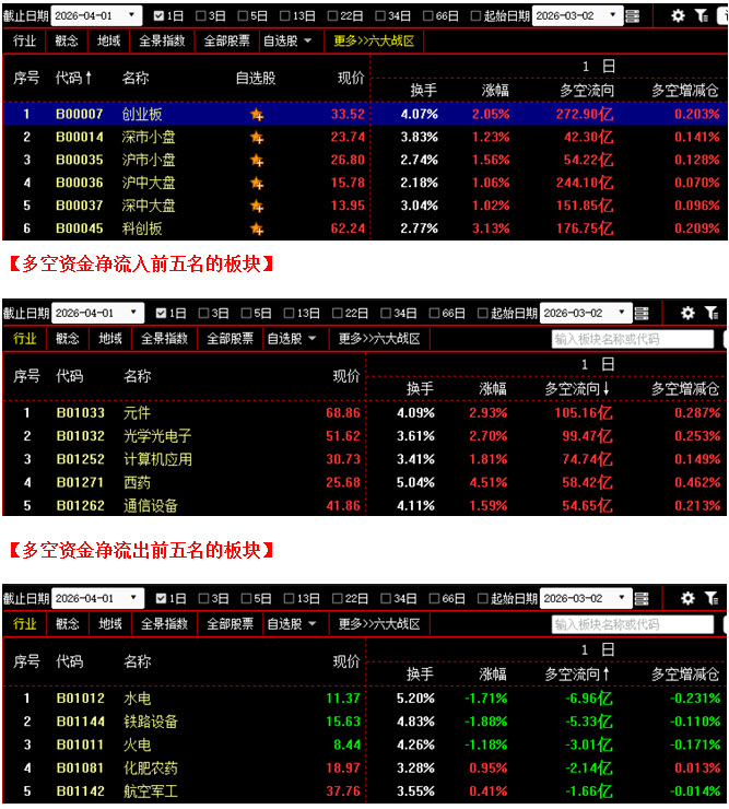 从板块资金动向数据来看,截止到今日收盘时,在资金流入榜上,元件板块以105.16亿的资金流入额位居榜首;其次是光学光电子板块,资金流入99.47亿;此外,计算机应用板块、西药板块、通信设备板块也都相继上榜,三个板块的资金流入额分别为74.74亿、58.42亿、54.65亿;再看资金流出榜,水电板块引领做空,资金流出6.96亿;其次是铁路设备板块,资金流出5.33亿;此外,火电板块、化肥农药板块、航天军工板块的资金流出额也都相对较多,分列资金流出榜第三到第五名位置。综合比较后可知,今日不仅元件板块资金流入高达105亿,光学光电子、计算机应用、西药、通信设备等板块的资金流入额也都在50亿之上,资金大幅回流,场内多方人气明显提升,全天资金流入超过10亿的板块多达23个;反观空方阵营,各板块的资金流出额均不足7亿,整体抛压较小。从六大战区的情况分别来看,截止到今日收盘时,六个战区均为资金流入状态,其中不仅深中大盘战区与科创板战区资金流入双双超过150亿,创业板战区与沪中大盘战区的资金流入额更是均在240亿之上。可见今日各战区均有资金大幅进场加仓,多方力量远远强于空方,具备着压倒性优势,投资者的做多信心随之快速提升。在这种情况下,近期表现较为低迷的行情就迎来了重新转强的曙光,接下来只要多方持续发力,市场有望在资金的推动下进一步向上回升。建议大家在控制好仓位的同时,关注近期有资金连续加仓的板块,并在其中优选个股,择机吸纳。