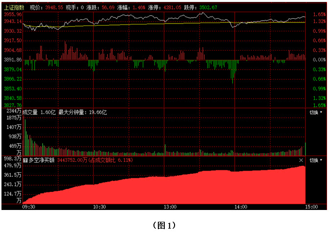 如图1所示,今日早间大盘大幅高开近50个点,随后指数虽有回探动作,但幅度不大,市场很快就在3930点附近获得支撑,并继续向上震荡攀升,经过几次尝试后,终于突破了3950点,可惜下午一点半后大盘出现一波回落,导致指数未能站稳在3950点上方,最终以3948点收盘。从下方的多空资金来看,早间开盘后,多方就占据优势,随后资金持续流入,即便在一点半后大盘回落的过程中,资金也没有出现快速流出迹象。可见今日多方资金进场十分坚决,空方毫无反击之力。在这种情况下,市场重心就会出现上移,所以即便接下来行情仍有反复,指数再次跌破3900点的概率也会大幅降低。建议大家可在控制好仓位的同时,关注近期股价跌出黄金坑信号后有资金连续回流的优质个股,择机介入。