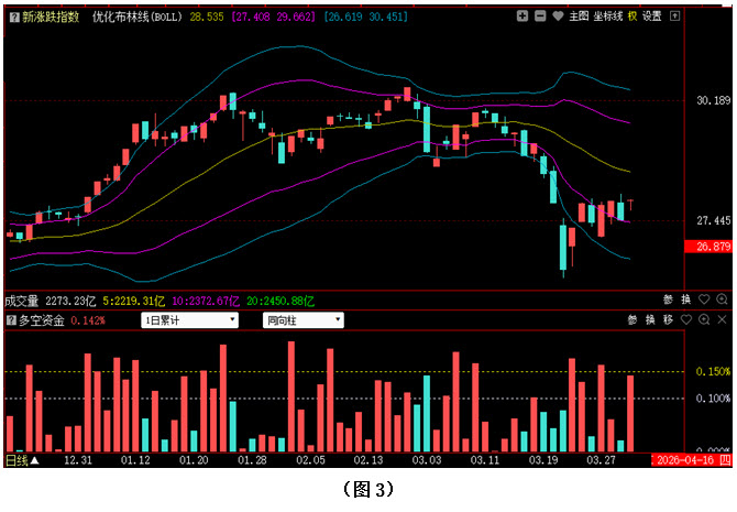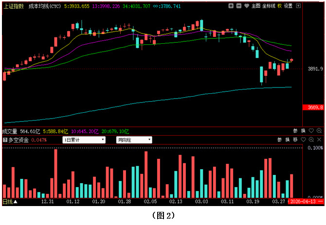 再看图2,今日大盘直接高开在5日成本均线上方,并在回抽5日成本均线后继续向上小幅拉升,最终以阳线报收。这是自3月13日之后指数首次收盘在5日成本均线上方,市场短期走势出现转强迹象。从下方的多空资金来看,今日多空资金为流入状态,且资金流入量超过了前两日资金流出量的总和,说明前两日因受到5日成本均线压制而出现的抛压已经被多方快速化解,所以接下来多方或有继续上攻的可能。不过需要注意的是,由于今日大盘高开幅度很大,上涨几乎一步到位,所以接下来指数能否站稳在5日成本均线上方还有待进一步观察。建议大家在控制好仓位的同时,密切关注多空资金的进出情况以及5日成本均线的支撑情况,若多方后续力量及时跟上,指数连续站稳在5日成本均线上方,则说明突破有效,后市继续向上攀升的可能性就会较大;反之,如果多方后续无力,空方再度施压,导致指数重新回落至5日成本均线下方,那么则不排除行情会有二次探底的可能。